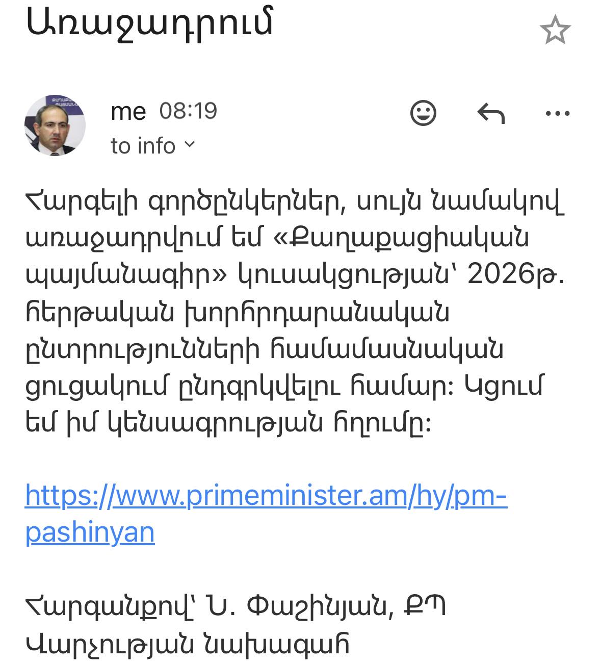 ՀՀ վարչապետ Նիկոլ Փաշինյանը սոցցանցի իր էջում գրել է, որ առաջադրվել է «Քաղաքացիական պայմանագիր» կուսակցության՝ 2026-ի հերթական խորհրդարանական ընտրությունների համամասնական ցուցակում ընդգրկվելու համար: