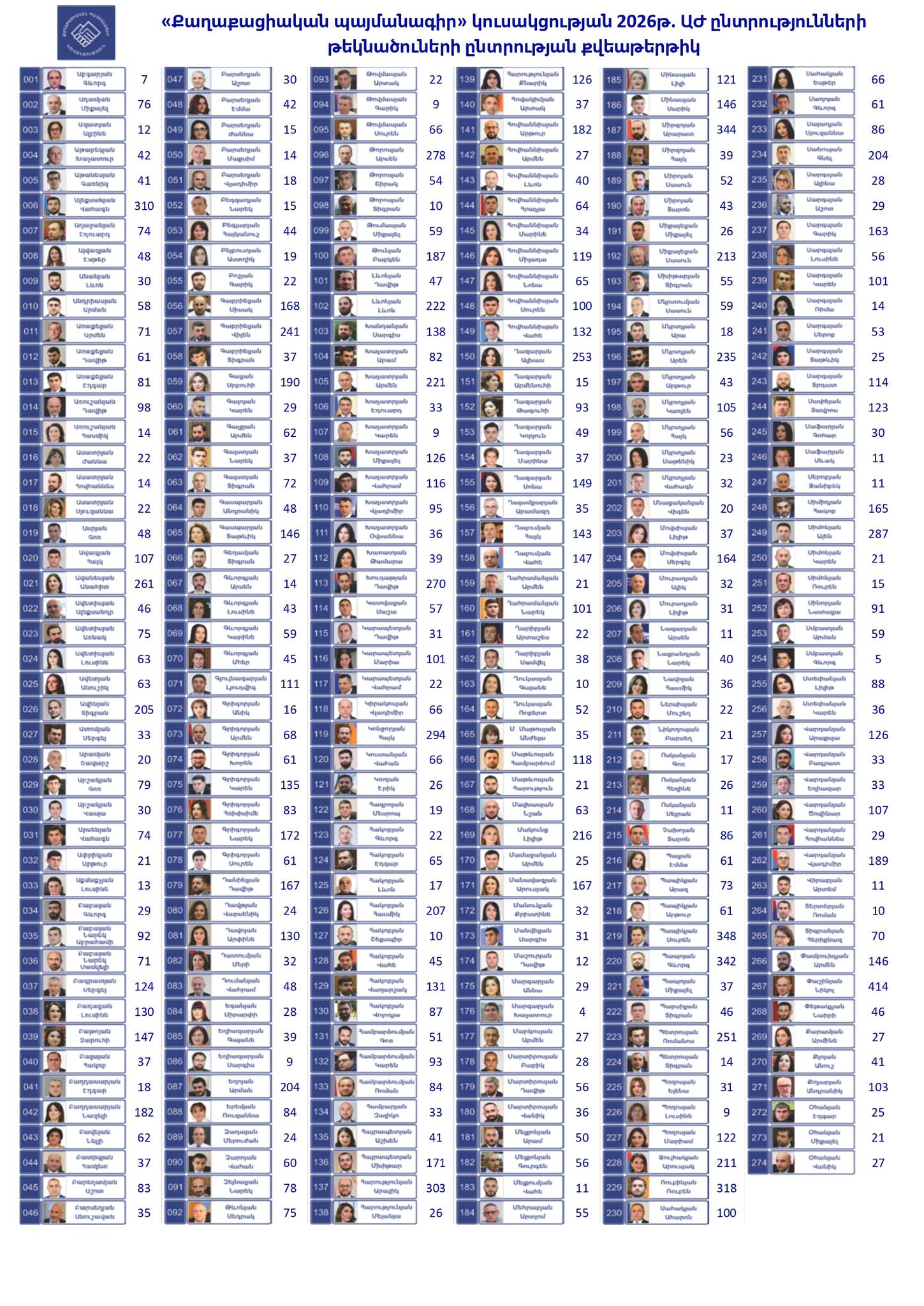Շարունակվում է 2026 թվականի հերթական ընտրություններում «Քաղաքացիական պայմանագիր» կուսակցության ընտրական ցուցակի հաստատման առաջին փուլի քվեարկության ձայների հաշվարկը։