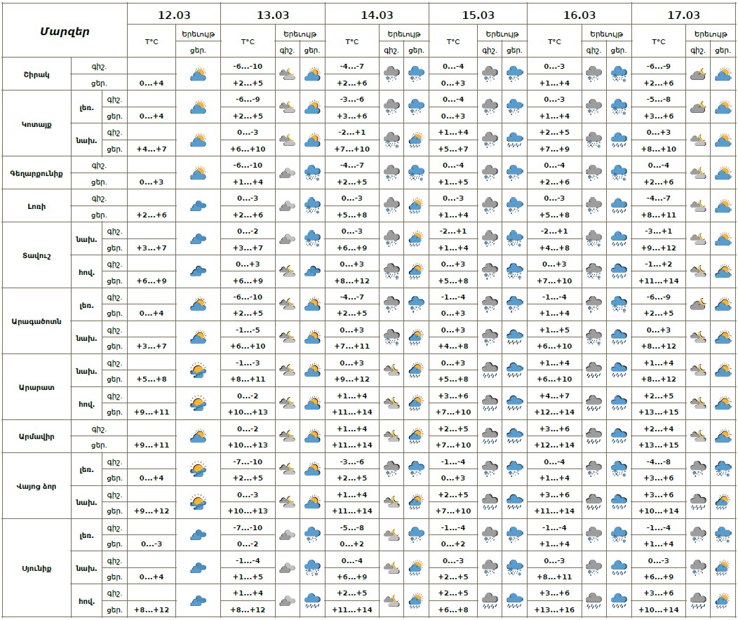 Հանրապետության տարածքում մարտի 13-ի գիշերը սպասվում է առանց տեղումների եղանակ։ Մարտի 13-ի ցերեկը, 14-ին, 17-ին առանձին շրջաններում, 15-16-ը ժամանակ առ ժամանակ շրջանների մեծ մասում սպասվում են տեղումներ, լեռնային և նախալեռնային շրջաններում ձյան, հովտային շրջաններում ձնախառն անձրևի և անձրևի տեսքով։