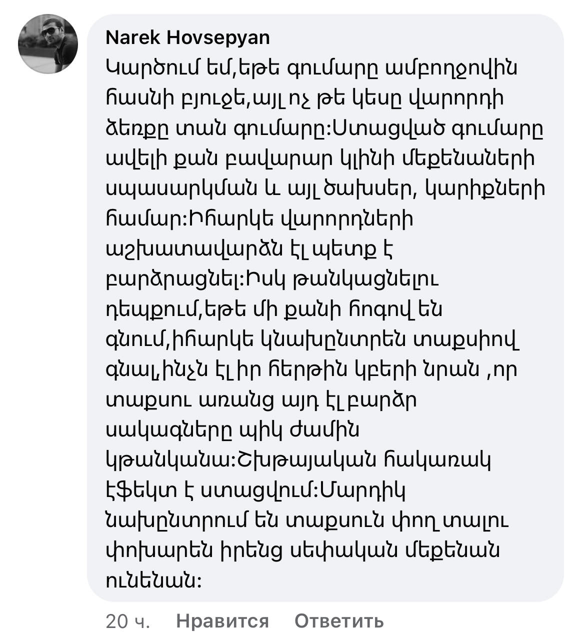 Իրենց առաջարկածը՝ էժանացումն է, առաջին հայացքից տպավորություն է, որ քաղաքացին դրանից օգտվելու է, բայց իրականում՝ ոչ, որովհետև այլ ոլորտներից ստիպված կրճատելու ենք, որպեսզի այդ գումարն ուղղենք սուբսիդավորմանն ու արդյունքում քաղաքացին էլի տուժելու է, ուղղակի տուժելու է տեսնելով, որ կանաչապատումն է վատ, տեսնելու է, որ մանկապարտեզը չսարքվեց, որ ասֆալտն է վատ, դրա համար մենք առաջարկում ենք բոլոր ոլորտները բալանսավորել: Իրենք վերցրել են Թբիլիսիի օրինակը, որի բյուջեն Երևանի բյուջեի կրկնապատիկն է ու ասում են՝ տեսեք այնտեղ այսքան գին է ու մի բան էլ Թբիլիսիից էժան գներ էին առաջարկում, որն անտրամաբանական է»:
