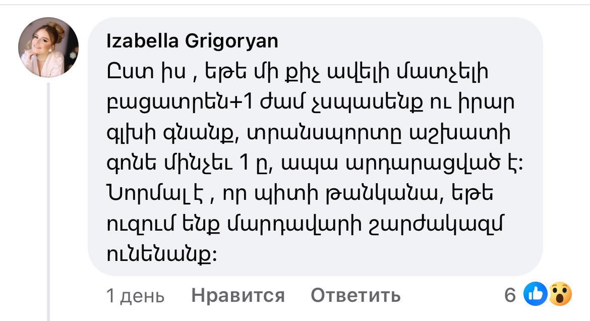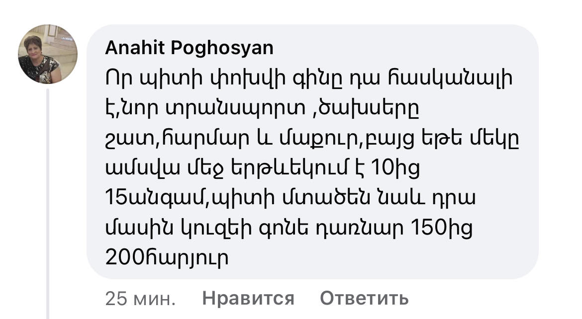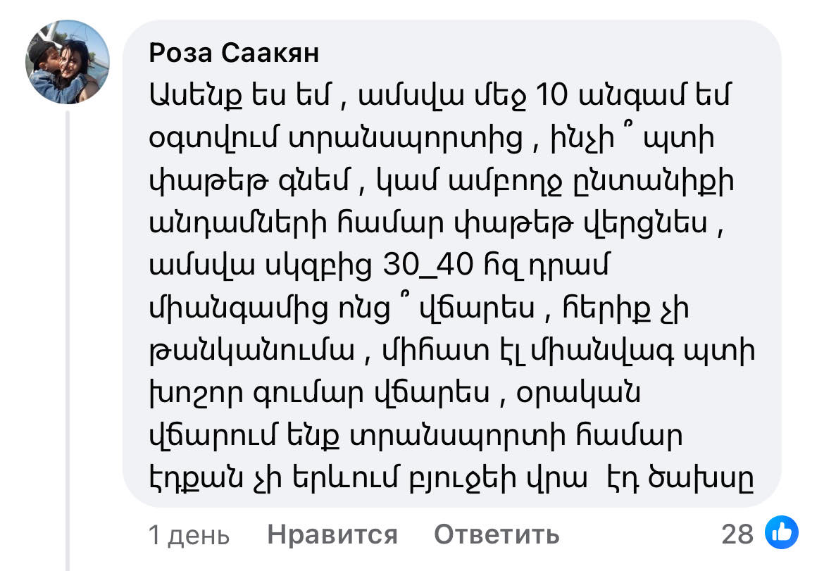 Այսօր թվեր են շրջանառվում, միայն 300 դրամի մասին են անընդհատ խոսում՝ փորձելով մարդկանց մոտ տպավորություն ստեղծել, որ 100 դրամից դառնում է 300 դրամ, այնինչ 300 դրամը միայն օրվա մասին է, որը հիմնականում չի վերաբերում այն մարդկանց, ովքեր ամեն օր են օգտվում տրանսպորտից, որովհետև ամեն օր օգտվողների համար կա փաթեթ, որը շատ ավելի մատչելի է: Օրինակ, եթե մարդն ամսվա մեջ տասը անգամ է նստում տրանսպորտ, կարող է գնել 10-անգամյա օգտագործման տոմս, որն արժե 2100 դրամ, որն այս դեպքում մի քիչ ավելի թանկ է լինում, եթե մի տոմսի վրա ենք հաշվարկում, այսինքն՝ մի տոմսը 210 դրամ կարժենա, եթե մարդն ամսվա մեջ տասը անգամ է օգտվում, դա նշանակում է, որ նա այդքան էլ հաճախ չի օգտվում տրանսպորտից, իսկ այն մարդը, որն ամեն օր գնում է աշխատանքի, հետ է գալիս, կամ որևէ այլ տեղ է գնում, իր համար նախընտրելի կլինի ամսական փաթեթը վերցնել, որը շատ ավելի մատչելի կլինի և հնարավոր է նույնիսկ դեպք, երբ անգամ 100 դրամից էլ քիչ իր վրա մի տոմսը նստի, եթե ինքը հաճախ սկսի օգտվել»: