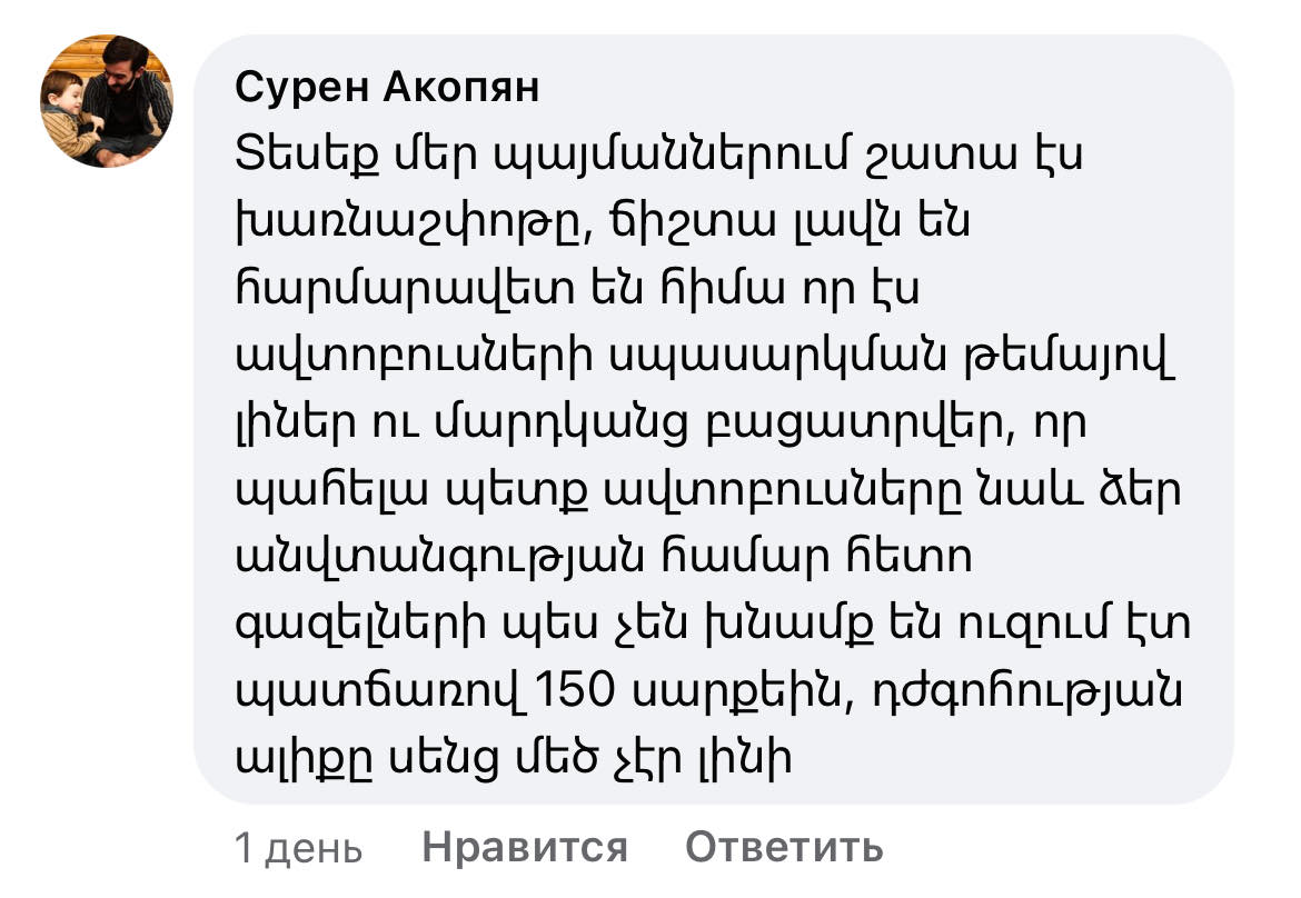 Մենք շուտով պետք է էլի ավտոբուսներ ձեռք բերենք, տասը տարի հետո նորից քաղաքը պետք է այս հարցին անդրադառնա, որովհետև ավտոբուսները տասը տարվա շահագործում են ենթադրում, տասը տարի հետո նորից պետք է ավտոբուսներ ձեռք բերվի, էլ չեմ խոսում ընթացիկ սպասարկման մասին՝ վառելիք, վարորդների աշխատավարձ, տեխնիկական սպասարկում և այլն, այս ամենը ենթադրում է միլիարդավոր դրամների ծախս, եթե մենք այսօր թողնենք այս սակագինը, քաղաքի բյուջեի շատ մեծ մասը պետք է ուղղենք տրանսպորտի սուբսիդավորմանը, իսկ դա ենթադրելու է, որ այլ ոլորտների, օրինակ՝ մանկապարտեզների վերանորոգման ծախսերը պետք է կրճատենք, ներդնենք տրանսպորտի վրա, կամ պետք է ասֆալտապատման ծավալները կրճատենք, կանաչապատման կամ ոռոգման համակարգի վրա ծախս չանենք, այսինքն՝ այդ ամեն ինչից պետք է կտրենք տանք տրանսպորտին, դրա համար մենք ուզում ենք՝ ոլորտին ուղղված ֆինանսավորումները բալանսավորել, որ մեկը մյուսի հաշվին չլինի»: